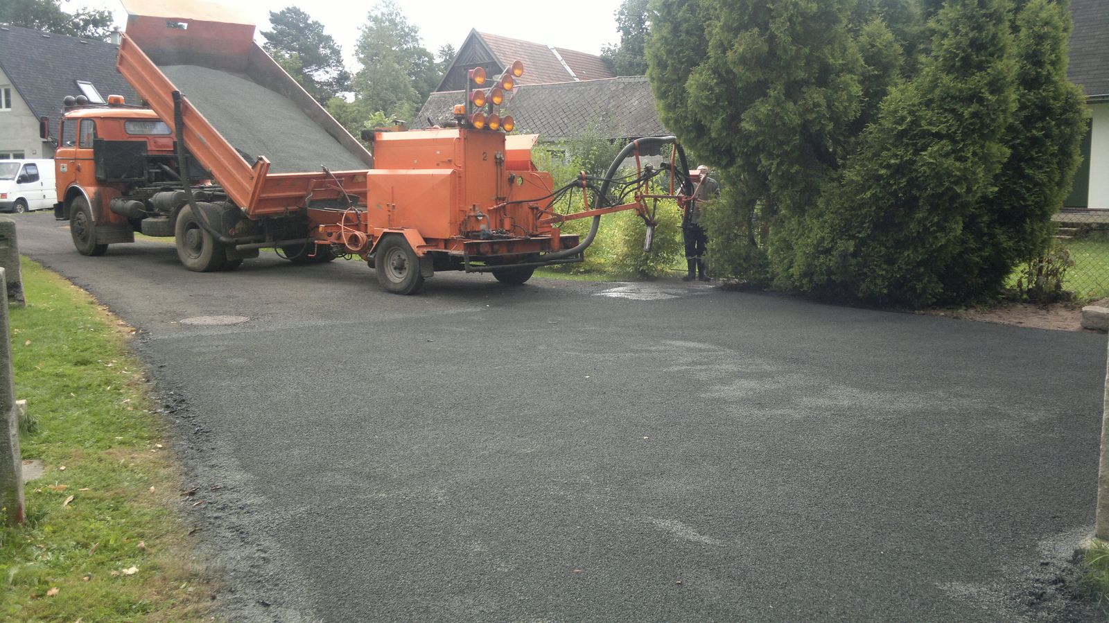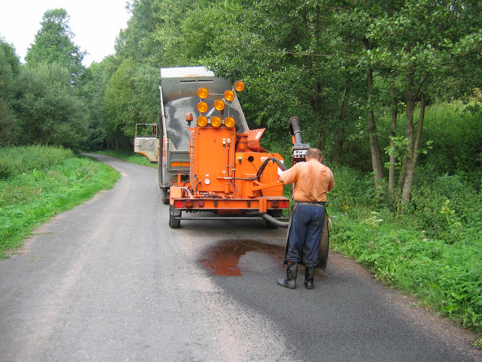 Nejprve očistíme poškozený povrch silnice stlačeným vzduchem, následuje postřik asfaltovou emulsí a nanesení vrstvy kameniva obaleného asfaltovým pojivem tlakem a množstvím vzduchu zajištěného turbodmychadlem. Poslední fází je tlakový posyp ošetřeného povrchu vozovky kamenivem.